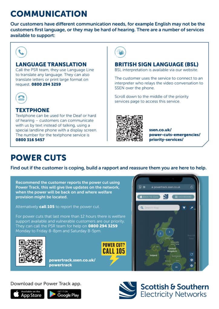 SSE has asked us to assist in informing residents of support they offer. Some customers (including elderly, sick, young families, carers, people with Dementia or those with communications needs) may need extra support and would benefit from the free priority services which includes: regular updates in power cuts, extra support and help with day to day communications. SSE offers a safe, free service.